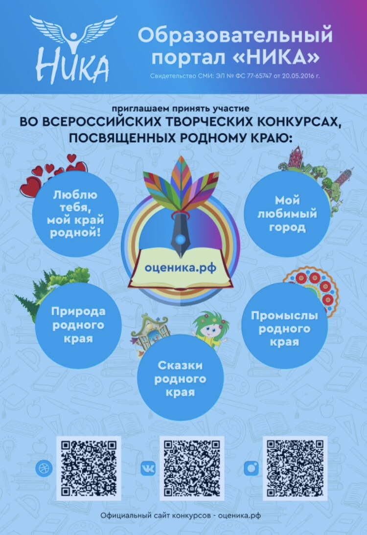 Образовательный портал «НИКА» (оценика.рф), являющийся всероссийским сетевым СМИ (свидетельство Роскомнадзора РФ ЭЛ № ФС 77-65747 от 20.05.2016 г.), предлагает участникам погрузиться в изучение культуры родного края, проявить активный интерес к народным промыслам региона и принять участие во всероссийских дистанционных конкурсах: