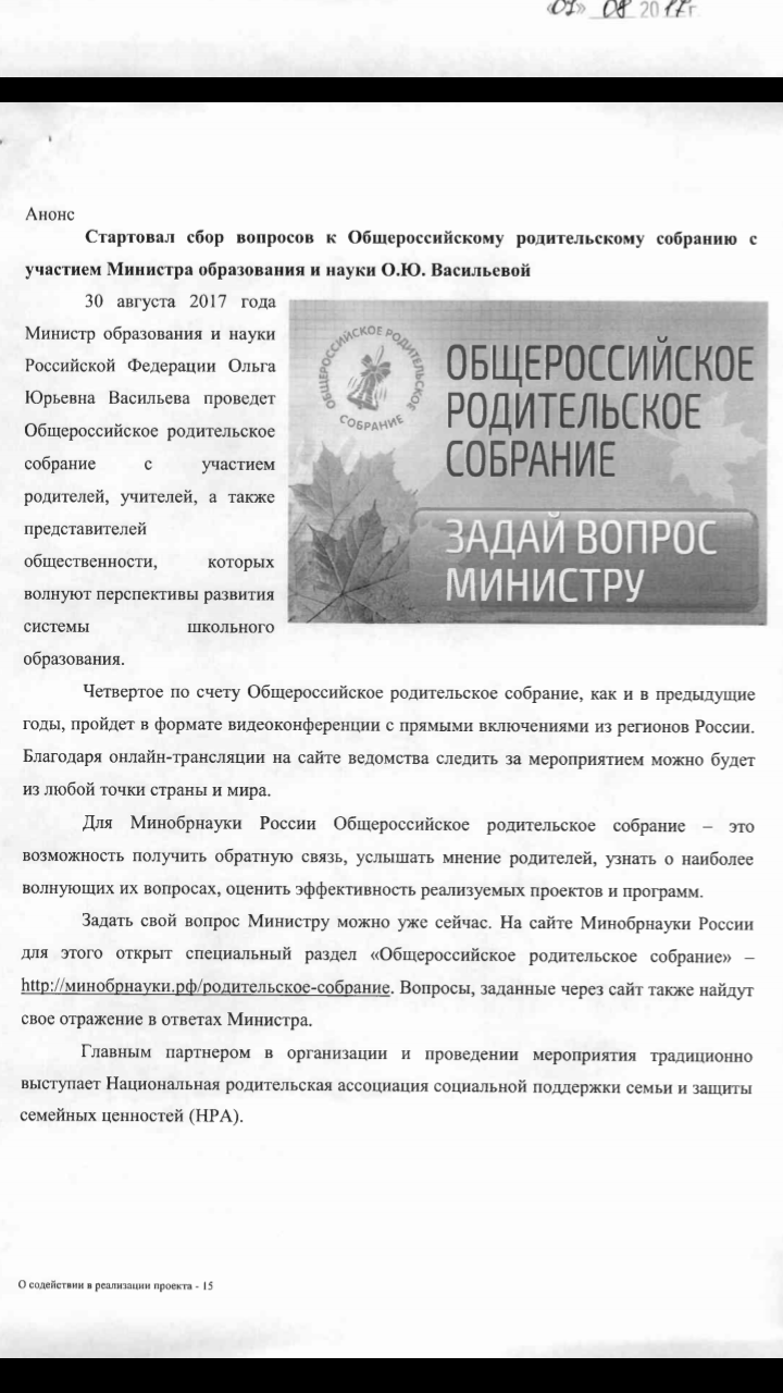 30.08.2017Министр образования и науки Российской Федерации Ольга Юрьевна Васильева проведет Общероссийское РОДИТЕЛЬСКИЕ собрание с участием родителей, учителей, а также представителей общественности, которых волнует перспективы развития системы школьного образования.
